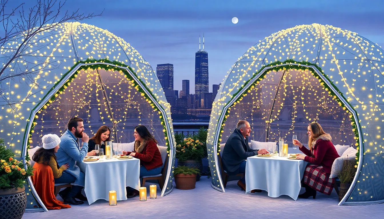 Igloo dining offers an unforgettable experience during Chicago’s winter season. Diners enjoy a blend of comfort and style within clear, cozy domes that provide a unique perspective of the city.
